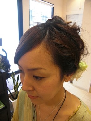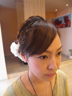 きっちりしすぎないルーズな編みこみで おしゃれ感を出しています。 生花を使う事で、より華やかさを演出しています。 花嫁さんにもお勧めのスタイルです!