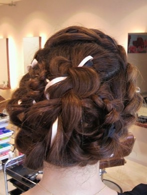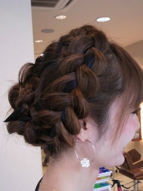 全体的に編み込んだ可愛らしいスタイルです。 リボンを一緒に編み込むことでより一層可愛さが引き立ちます♪ 編み込むリボンの色を変えるといろんな表情が出てきますよ。
